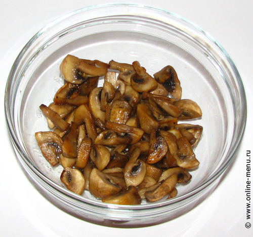 Шампиньоны порезать и обжарить, посолить, охладить.