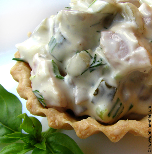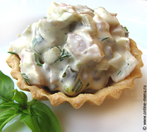 Все перемешать с майонезом и получившимся салатом наполнить тарталетки.