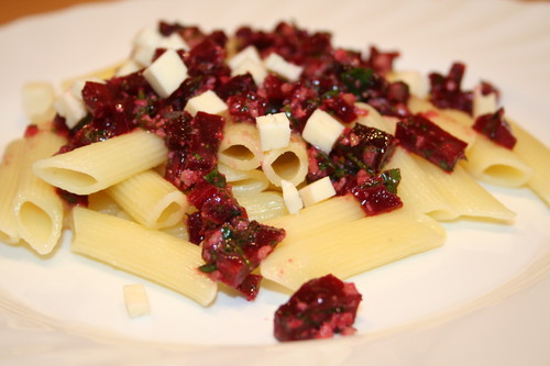 Пенне отварить. Разложить по тарелкам. Сверху выложить свекольный соус и посыпать раскрошенной брынзой.